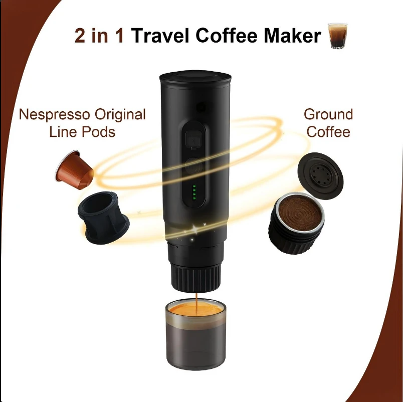 Cafetera Portátil 2 en 1, por que sirve tanto para capsulas y para cafe molido.